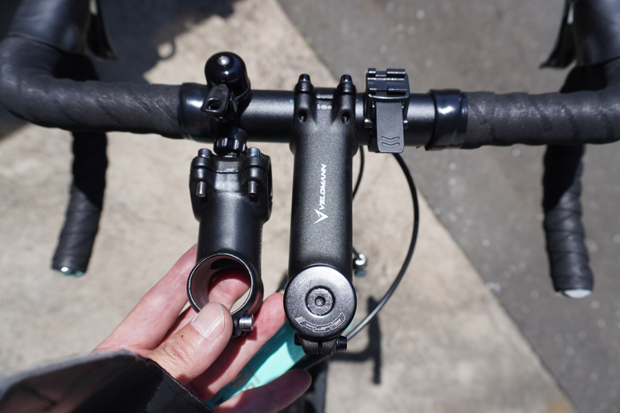 ということで、ステムを早速交換してみた。 長さは60mmで、ものはアマゾンで買った安物。 これで良ければメーカーには拘らないので、このままで良いが、もう少し短いのも注文してみたので連休中に届いたら試してみる。