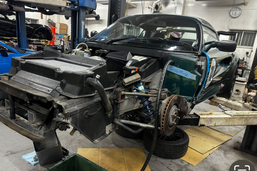 私が伺った時はフロントカウルが外されており、ラジエターをハイブリッドラジエターに交換する所だった。 この画像はラジエターを外す前の状況。 色々と依頼事項が多いのだが、先ずは走れるようにしましょう、との事だったので、「宜しくお願い致します」と伝えて工場を後にした。