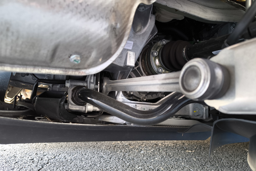 オーナーなら気がつくかも知れない点を一つ、左側にストレーキが付いているのが見えるだろうか。 このストレーキ、車体下に突出させる寸法が可動式となっており、この画像のように最上部まで上げるとアンダーステアが軽くなる、らしい。