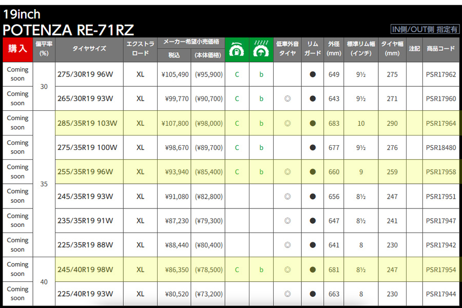定価だとRE71RSはメッチャ高いが、平野タイヤさんだと以下の価格。