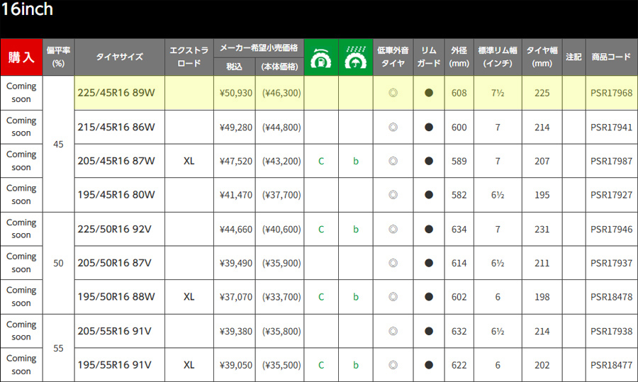 どうも16インチの225/45R16は数が出ないのか、割高感を感じる。