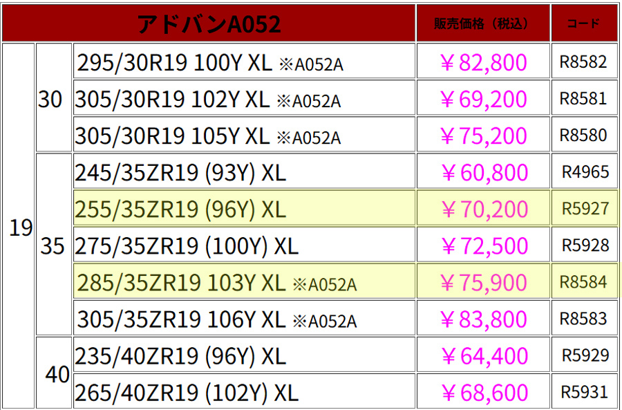 次はアドバンA052、私はこのタイヤが大好きなのだが、高いねぇ。